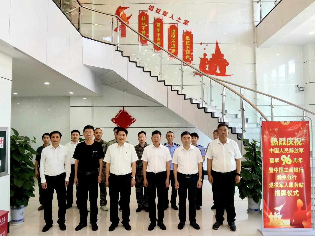 在中国人民解放军建军96周年到来之际,7月27日上午,滁州市首家金融机构退役军人服务站在中国工商银行滁州分行揭牌。工行滁州分行副行长黄学东、滁州市退役军人事务局党组成员副局长孙仁健等领导出席揭牌仪式并致辞。